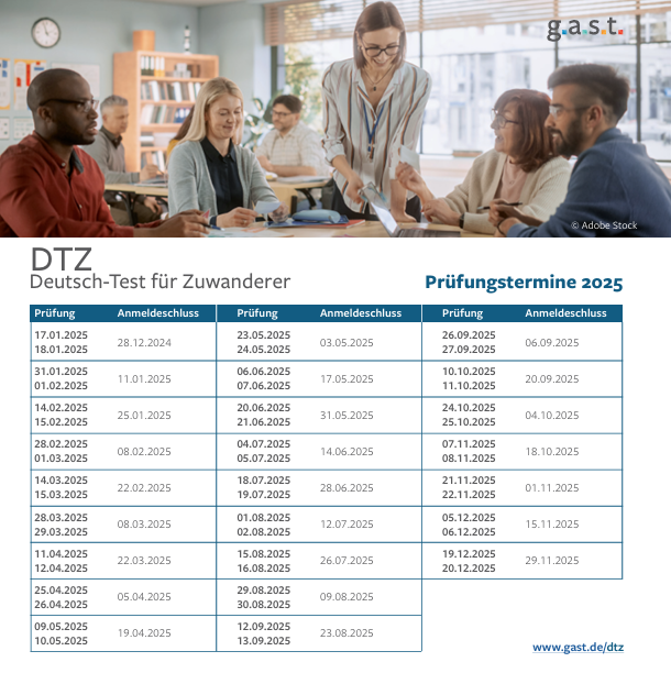Unsere B1-Prüfungsvorbereitungskurse sind zeitlich so geplant, dass sie direkt vor offiziellen DTZ-Prüfungsterminen (z. B. bei G.A.S.T, telc oder anderen anerkannten Prüfstellen) enden.